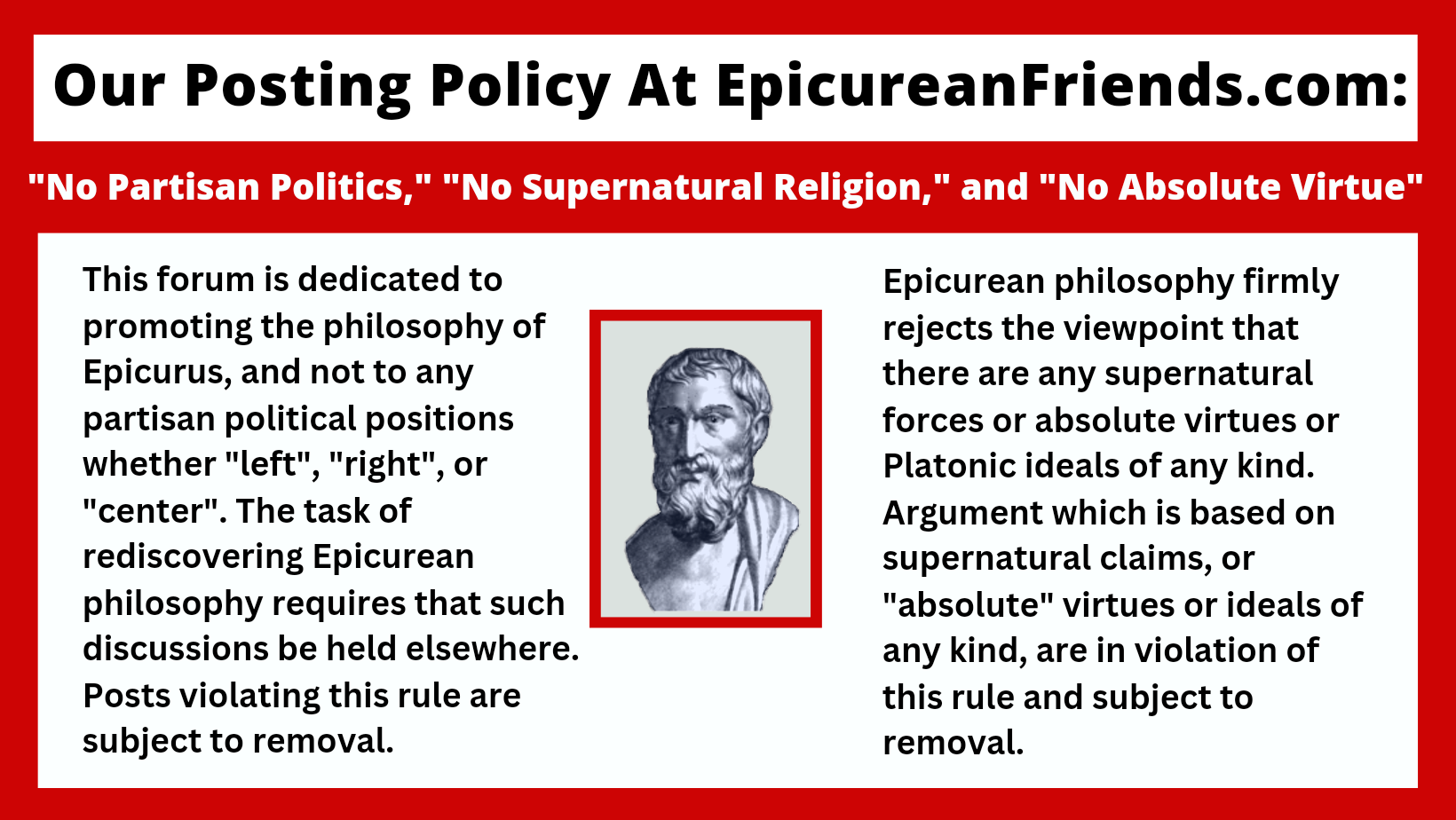 EpicureanFriends is a community of real people dedicated to the study and promotion of Classical Epicurean Philosophy. We offer what no encyclopedia, AI chatbot, textbook, or general philosophy forum can provide — genuine teamwork among people committed to rediscovering and restoring the actual teachings of Epicurus, unadulterated by Stoicism, Skepticism, Supernatural Religion, Humanism, or other incompatible philosophies.