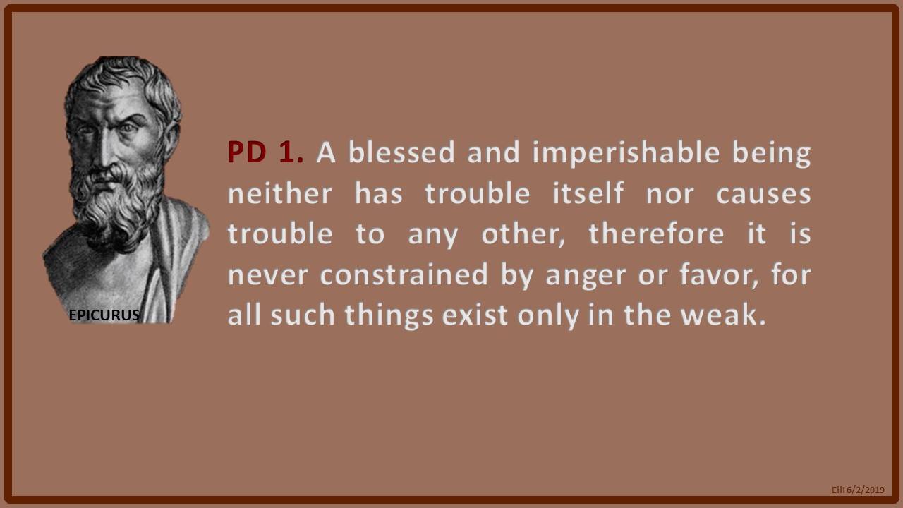 Epicurus Principle Doctrine One: "A blessed and imperishable being neither has trouble itself nor causes trouble to any other,therefore it is never constrained by anger or favor, for all such things exist only in the weak."