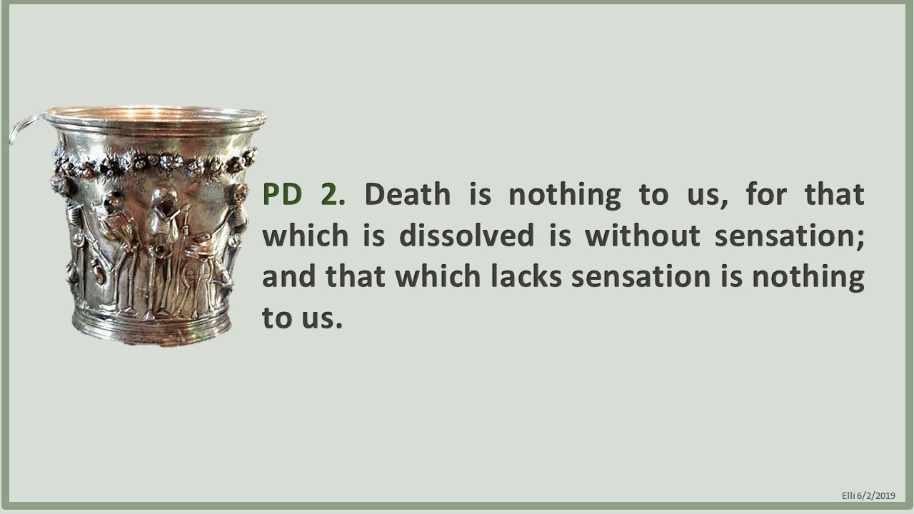 Epicurus Principal Doctrine Two: “Death is nothing to us; for that is dissolved is without sensation, and that which lacks sensation is nothing to us.”