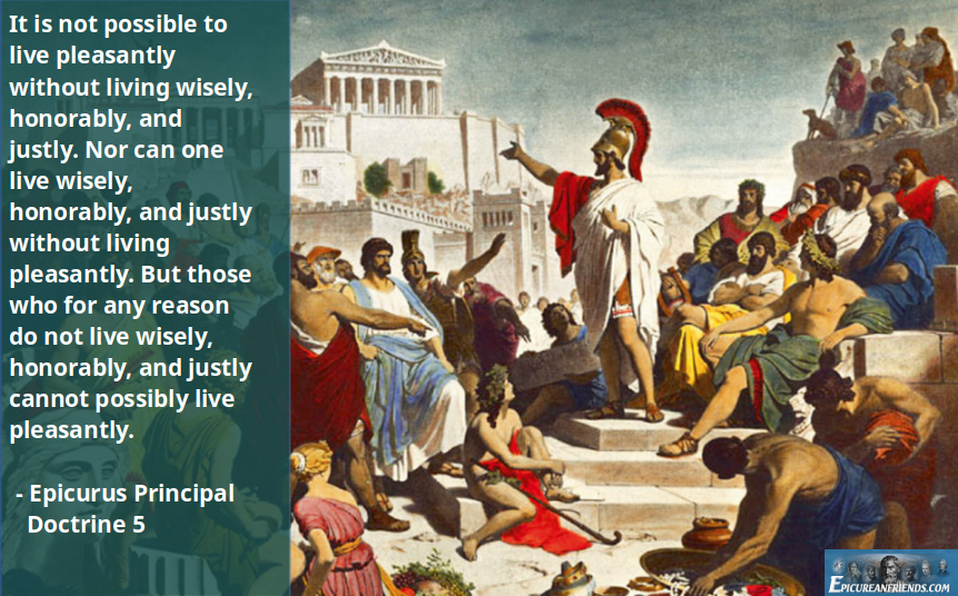 **Visualizing Principal Doctrine 5** This doctrine is commonly cited by those who wish to equate Epicurus with Stoicism, and to argue that both are essentially the same because they value "virtue." The text is: "It is not possible to live pleasantly without living wisely, honorably, and justly. Nor can one live wisely, honorably, and justly without living pleasantly. But those who for any reason do not live wisely, honorably, and justly cannot possibly live pleasantly."
