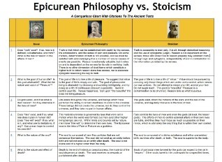 This chart comparing the major features of Stoicism vs Epicurean philosophy is a continuing work in progress! It is currently hosted at a Google Docs page to make editing easier. Feel free to make comments and suggestions in the Forum thread associated with this article. Click on this link to go to the chart: Reference: Comparison Chart of Epicurean and Stoic Views