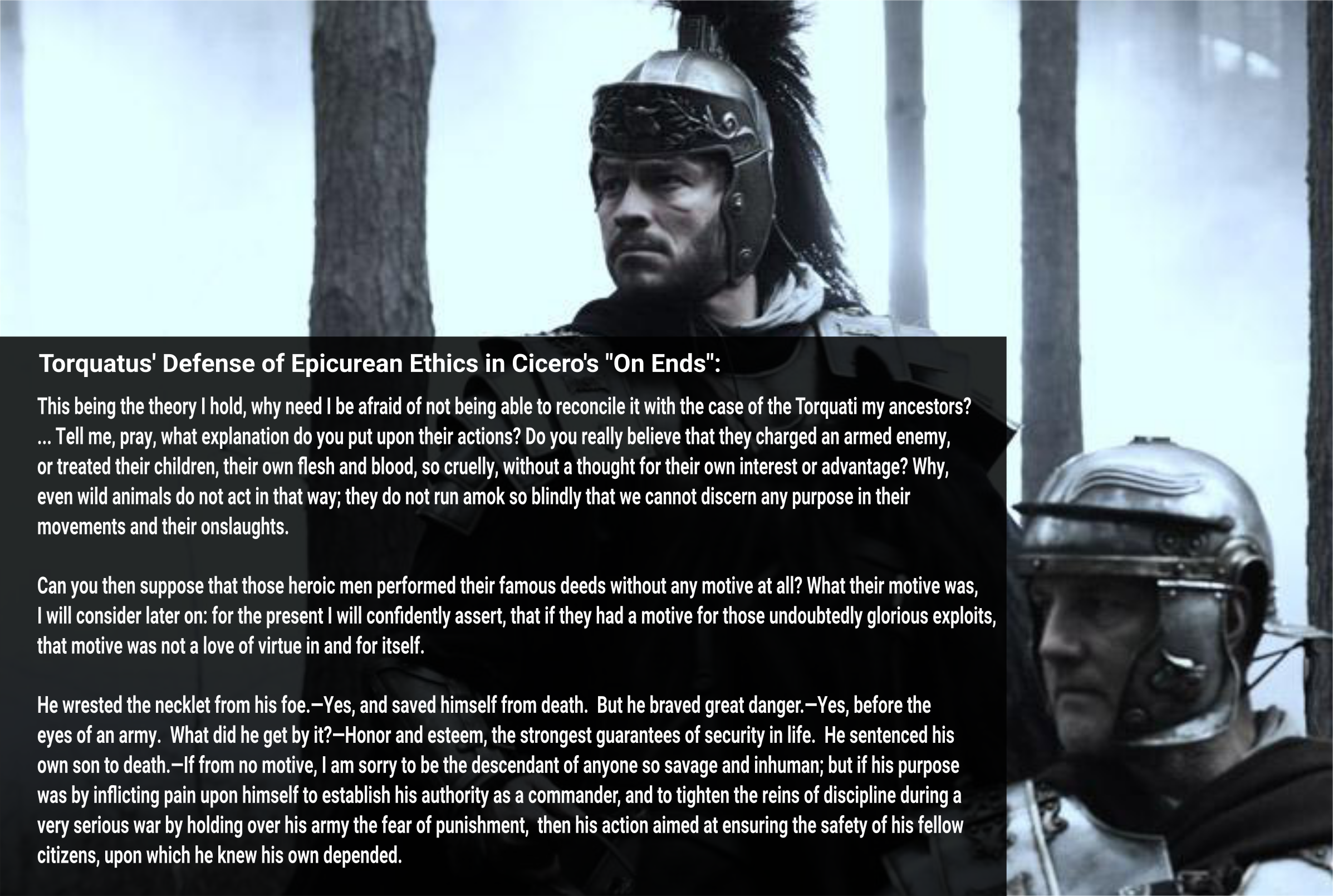 Can you then suppose that those heroic men performed their famous deeds without any motive at all? What their motive was, I will consider later on: for the present I will confidently assert, that if they had a motive for those undoubtedly glorious exploits, that motive was not a love of virtue in and for itself.—He wrested the necklet from his foe.—Yes, and saved himself from death. But he braved great danger.—Yes, before the eyes of an army.—What did he get by it?—Honor and esteem, the strongest guarantees of security in life.—He sentenced his own son to death.—If from no motive, I am sorry to be the descendant of anyone so savage and inhuman; but if his purpose was by inflicting pain upon himself to establish his authority as a commander, and to tighten the reins of discipline during a very serious war by holding over his army the fear of punishment, then his action aimed at ensuring the safety of his fellow citizens, upon which he knew his own depended.