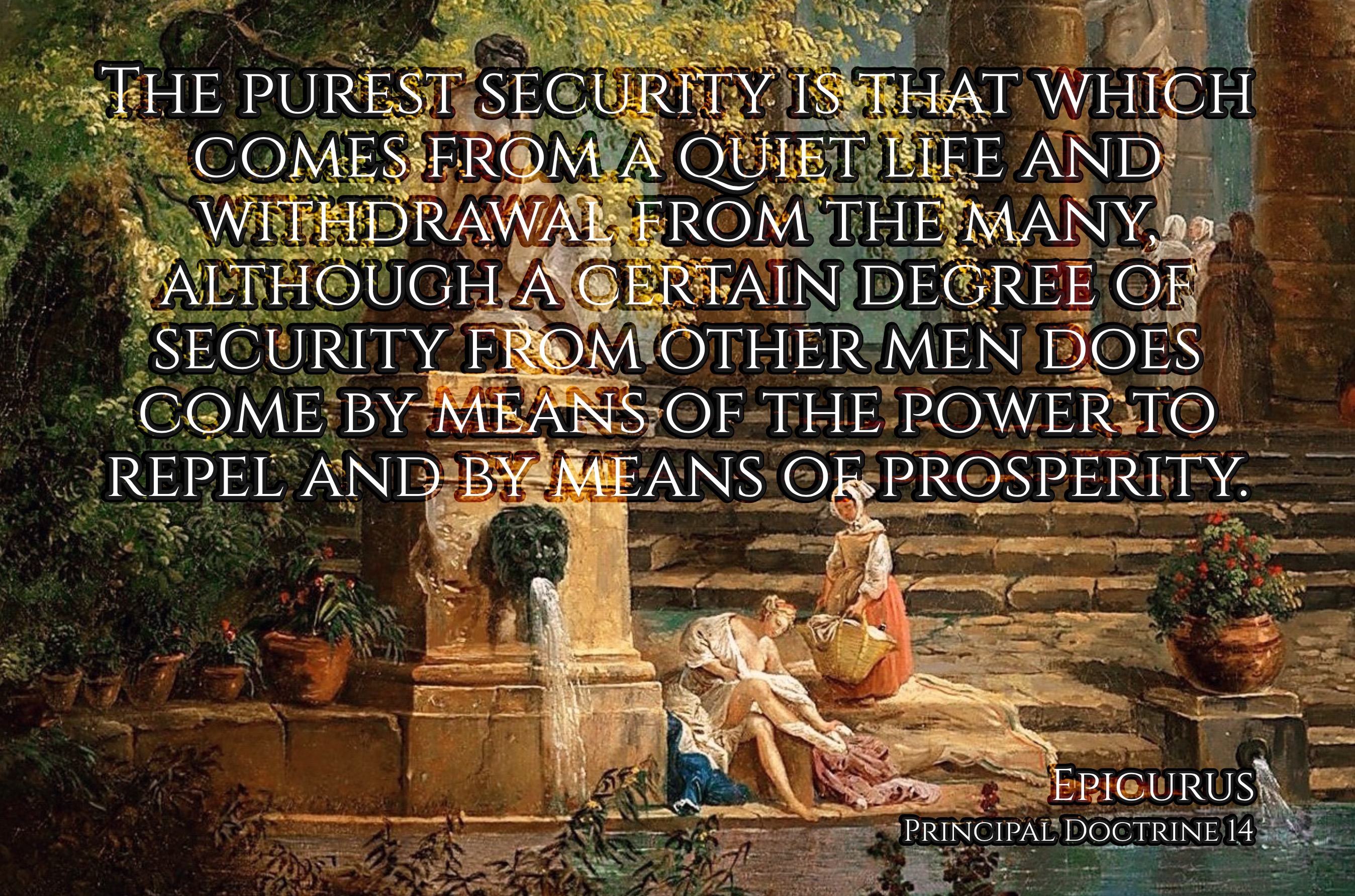 XIV "The purest security is that which comes from a quiet life and withdrawal from the many, although a certain degree of security from other men does come by means of the power to repel [attacks] and by means of prosperity." (Epicurus, Principal Doctrine 14) PD14