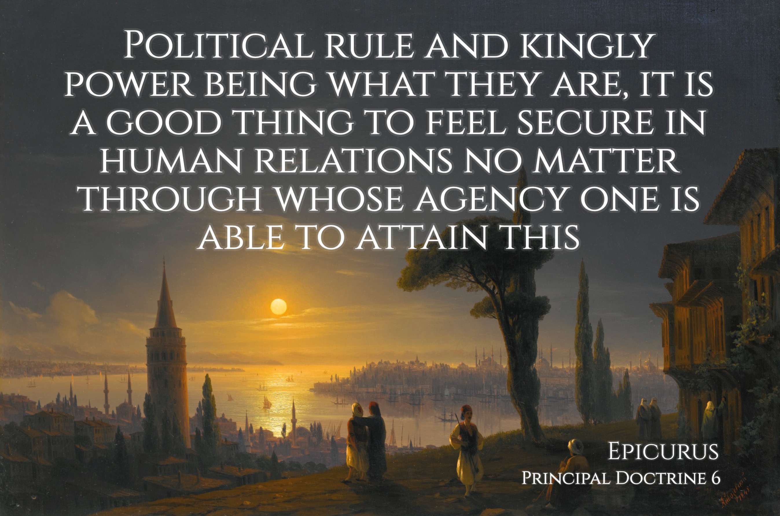 “Political rule and kingly power being what they are, it is a good thing to feel secure in human relations no matter through whose agency one is able to attain this." (Epicurus, Principal Doctrine 6)