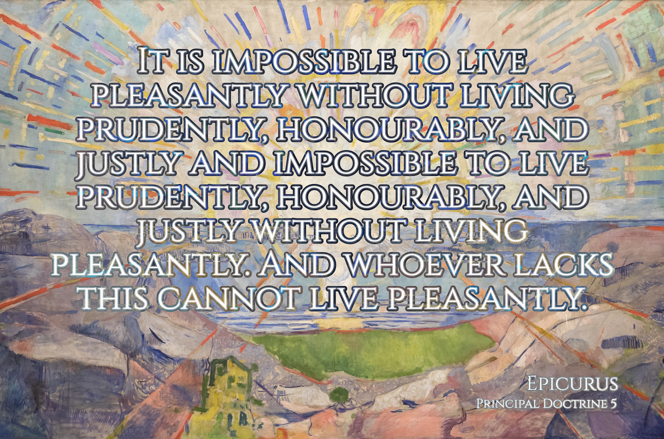 “It is impossible to live pleasantly without living prudently, honourably, and justly and impossible to live prudently, honourably, and justly without living pleasantly. And whoever lacks this cannot live pleasantly.” (Epicurus, Principal Doctrine 5)
