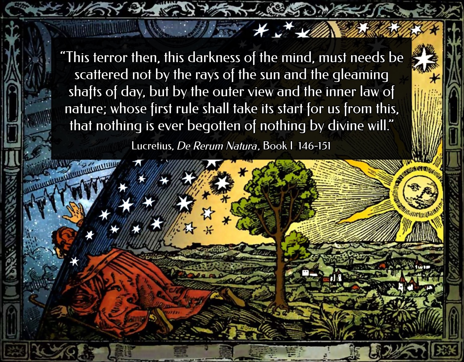 “This terror then, this darkness of the mind, must needs be scattered not by the rays of the sun and the gleaming shafts of day, but by the outer view and the inner law of nature; whose first rule shall take its start for us from this, that nothing is ever begotten of nothing by divine will.” (V 146-151)