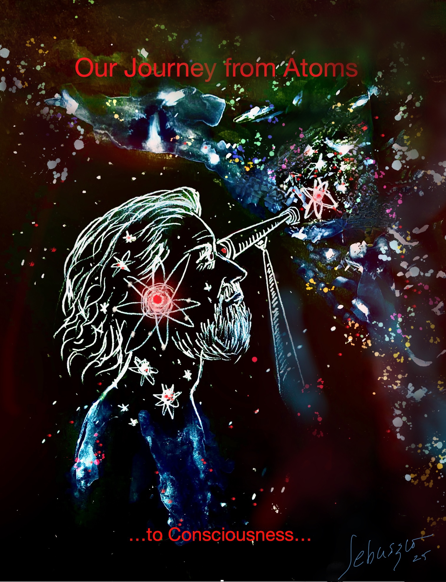 The evolution of the universe and of life on Earth has brought consciousness to fruition across all life forms, especially in humans, who think and reflect on their place in the universe. Thus, I believe that consciousness is the fragrant flower of the evolution of the Cosmos and of life. In the illustration above, I have attempted to show how we, as humans, have evolved to an awareness of our atomic origins through the rigors of science.