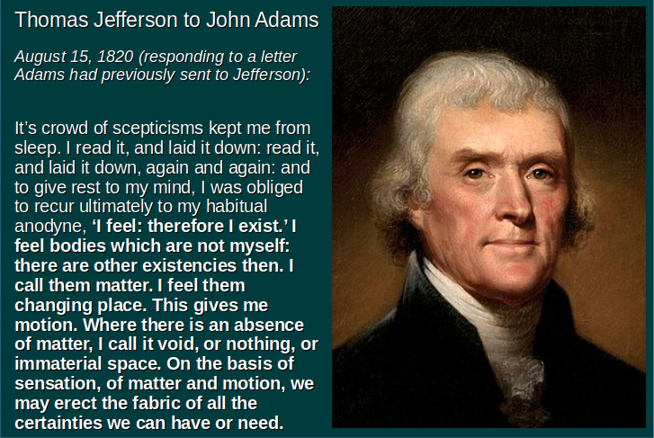 And though reason is not able to assign a cause why an object that is really four-square when near, should appear round when seen at a distance; yet, if we cannot explain this difficulty, it is better to give any solution, even a false one, than to deliver up all Certainty out of our power, to break in upon our first principle of belief, and tear up all foundations upon which our life and security depend. For not only all reason must be overthrown, but life itself must be immediately extinguished, unless you give credit to your senses. These direct you to fly from a precipice and other evils of this sort which are to be avoided, and to pursue what tends to your security. All therefore is nothing more than an empty parade of words that can be offered against the certainty of sense. [Lucretius, On the Nature of Things, Book 4, Daniel Browne edition]