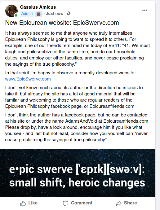 And time has also indicated to us that if you can find the time to read one book which will best explain classical Epicurean philosophy, as opposed to most modern "eclectic" interpretations of Epicurus, that book is Norman DeWitt's Epicurus And His Philosophy.