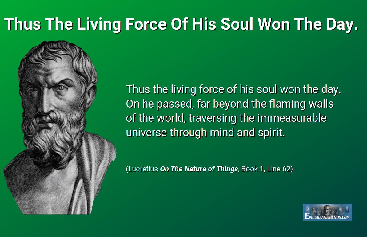 Thus the living force of his soul won the day. On he passed, far beyond the flaming walls of the world, traversing the immeasurable universe through mind and spirit. (Lucretius Book 1, Line 62)