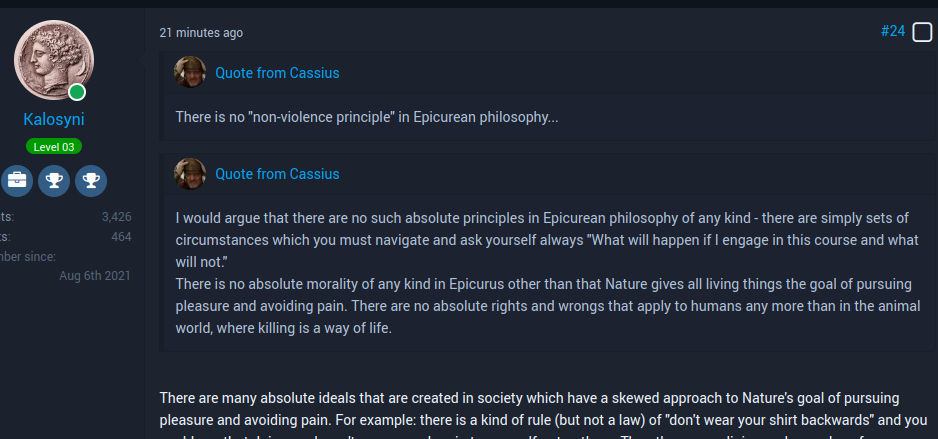 Also to be clear here, what I maybe should have written rather than "there is no 'non-violence' principle in Epicurean philosophy" would be something more like "there is no absolute rule against the initiation of violence in Epicurean philosophy as there is in Libertarian philosophy."