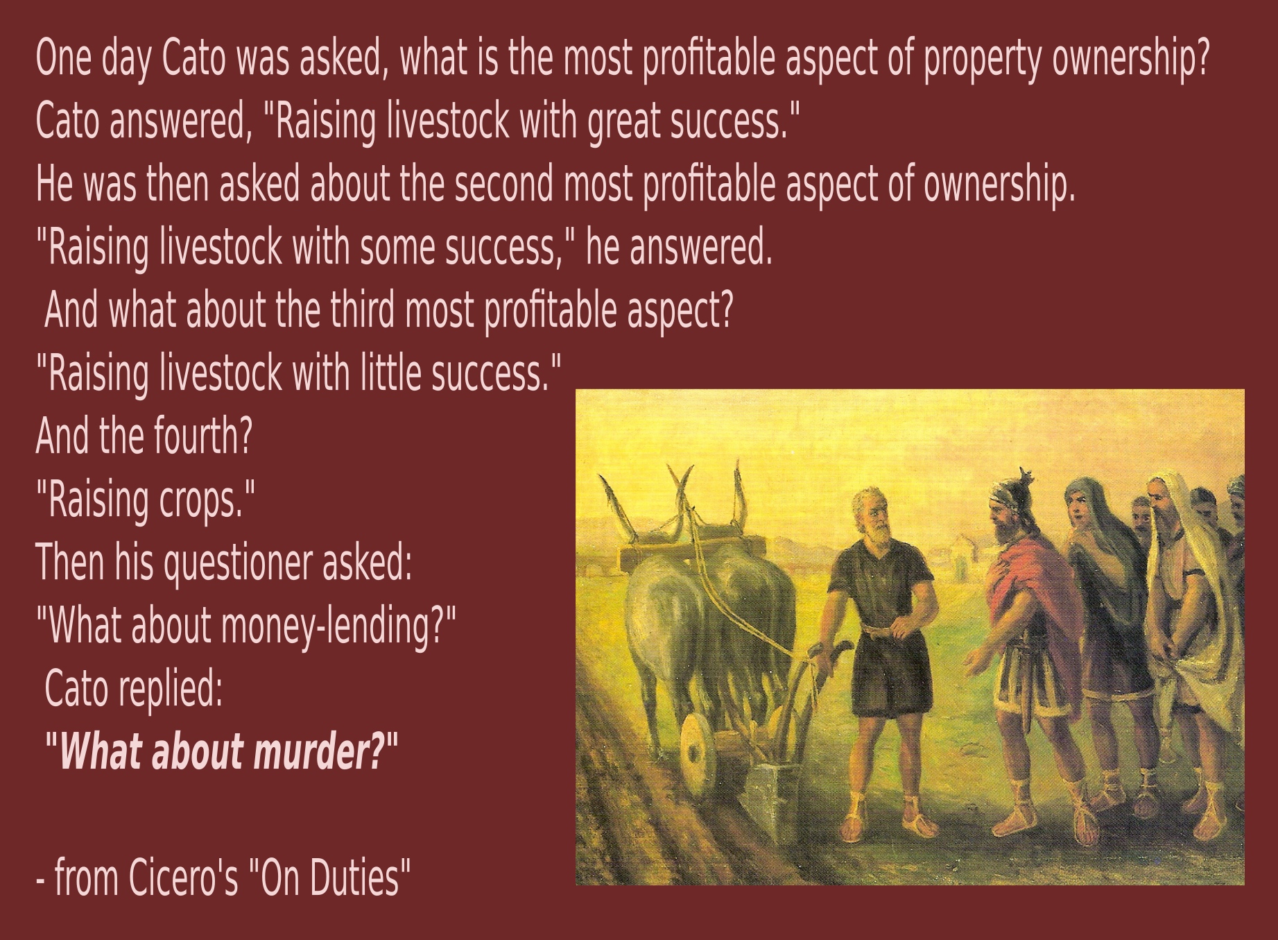Cato answered, "Raising livestock with great success."