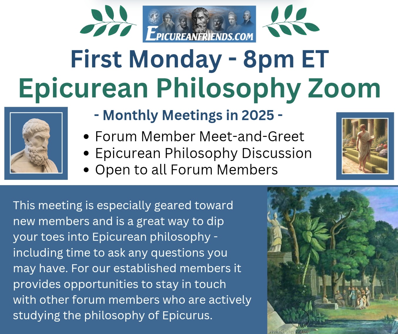 On the first Monday of each month, is our "meet-and-greet" and Epicurean philosophy discussion - open to all forum members!