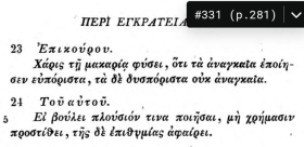 Today we will look at the four points that are summarized all-too-briefly in the "Tetrapharmakon," and we will expand on the meaning of each branch by referring to the full text of the first four Principal Doctrines, supporting statements in the letters and fragments of Epicurus, and to where Cicero has Torquatus reference them in Book One of On Ends, including: