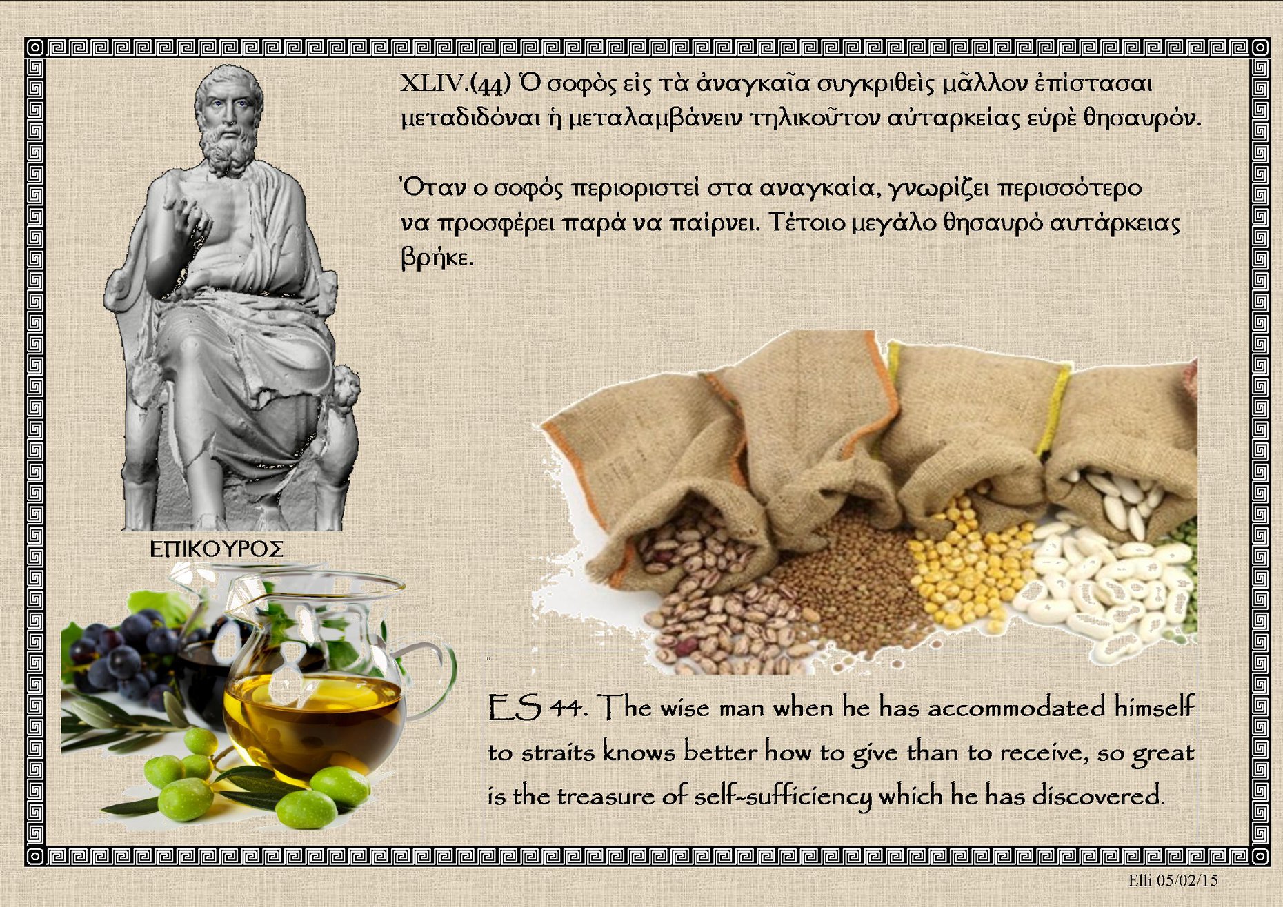 -ES 44. "The wise man when he has accommodated himself to straits knows better how to give than to receive, so great is the treasure of self-sufficiency which he has discovered".