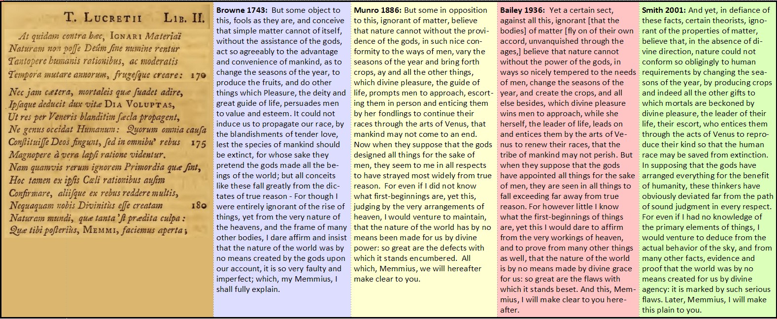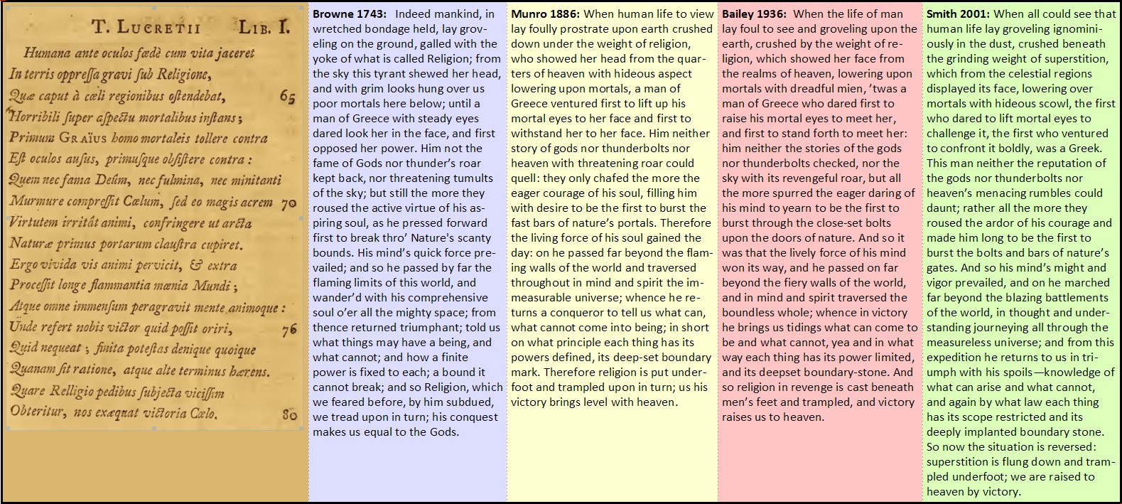 I think these side-by-side Latin and alternate translations are helpful. Slight word changes can lead to significant changes in meaning, and translators tend to add or subtract words depending on their own view of what a passage "should" mean. Here is perhaps the most famous passage of all from Lucretius Book 1 -