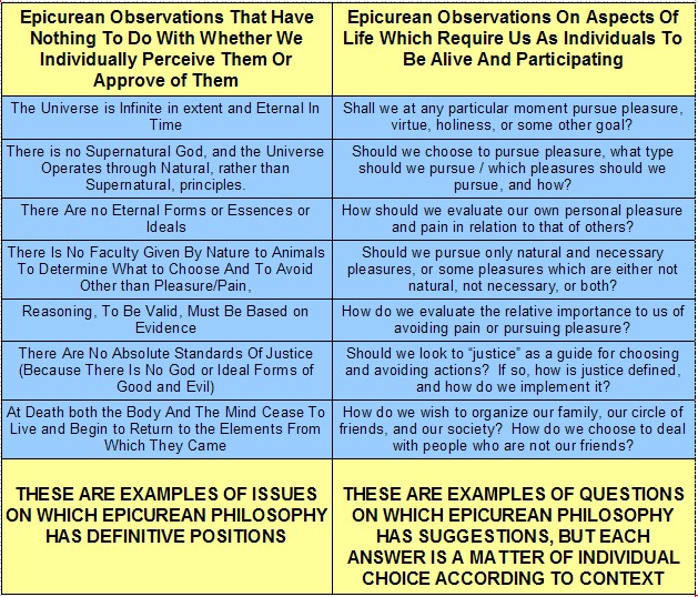 Ethics: Morality/ethics has meaning only to a living mind/spirit, and our mind/spirit ceases to exist at death. Pleasure is the guide of the living, and there are no absolute ethical standards set by supernatural gods or by ideal forms of virtue.