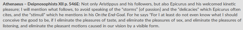 In the absence of Cicero's commentaries this whole pleasure=tranquility=asceticism would probably never have gotten started, but in fairness to Cicero he also preserved much information that indicates points to what I think is the real truth, such as in parts of the Torquatus narrative in On Ends, and in passages such as :
