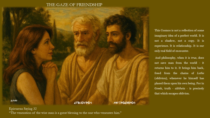 Epicurus, in the Hellenistic era, within a Garden - as a friend among friends, not merely a teacher among students - made the deviation of deviations. They did not seek the spectacle of the imaginary - they sought the truth of the tangible real. They did not build a system - they highlighted the natural and the shared of experience. Thus, separating wheat from chaff, they offered the essence of the entire Hellenic worldview: the body as carrier of experience, sensation as source of knowledge, emotion as indicator of truth, the face as relationship, knowledge as transmission, and freedom as syneidénai — conscious awareness.