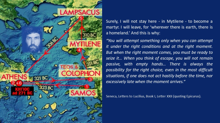 It was then, in Mytilene, that everything was at stake - even the very life of Epicurus. It was then that he began to make the most serious decisions of his life, when his presence provoked unrest and reaction; it was then that the dogmatic schools of endless dialectic and empty talk saw him as a threat and rose against him, shouting like a mob with the scorpion’s tail ready to strike:
