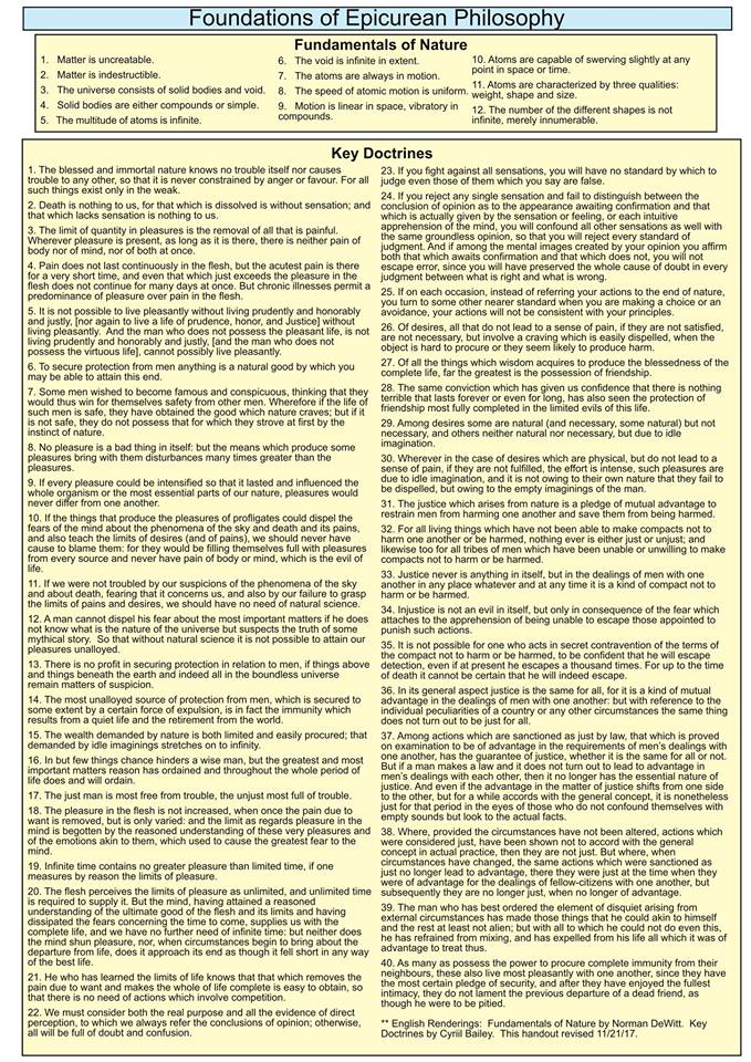 Due to my age I remember a time before smartphones when I carried around my notes and to-do lists on printed pieces of letter-sized paper folded to fit in my pocket. Today I decided I wanted to have that same kind of ready access to the main Epicurean doctrines, so I produced the attached PDF of the 12 fundamentals of nature (physics) and the 40 doctrines. I also hope to use this as a handout at Meetup meetings and other presentations in the future. As I find typos and/or make improvements I will update revisions here. I hope someone finds this helpful. (Download by clicking the blue button at the top right.)