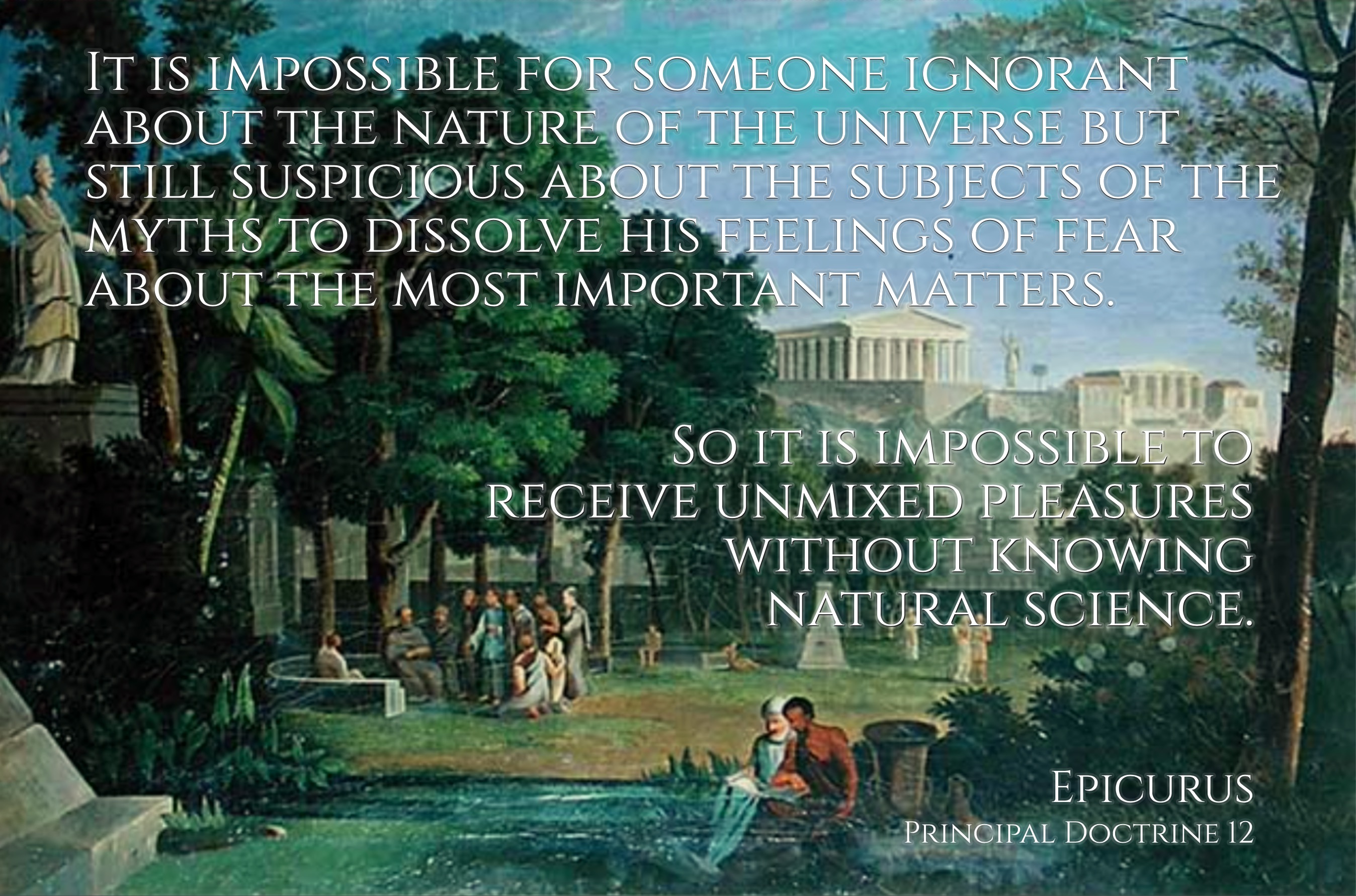 XII "It is impossible for someone ignorant about the nature of the universe but still suspicious about the subjects of the myths to dissolve his feelings of fear about the most important matters. So it is impossible to receive unmixed pleasures without knowing natural science." (Epicurus, Principal Doctrine 12)