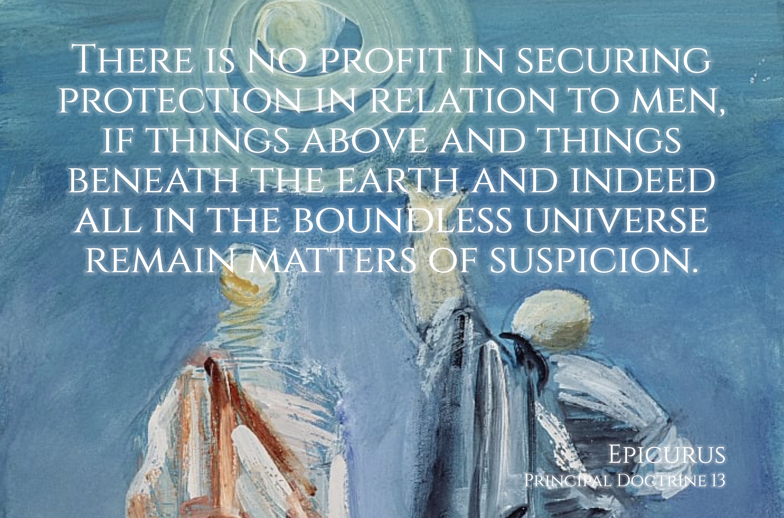 XIII "There is no profit in securing protection in relation to men, if things above and things beneath the earth and indeed all in the boundless universe remain matters of suspicion." (Epicurus, Principal Doctrine 13)