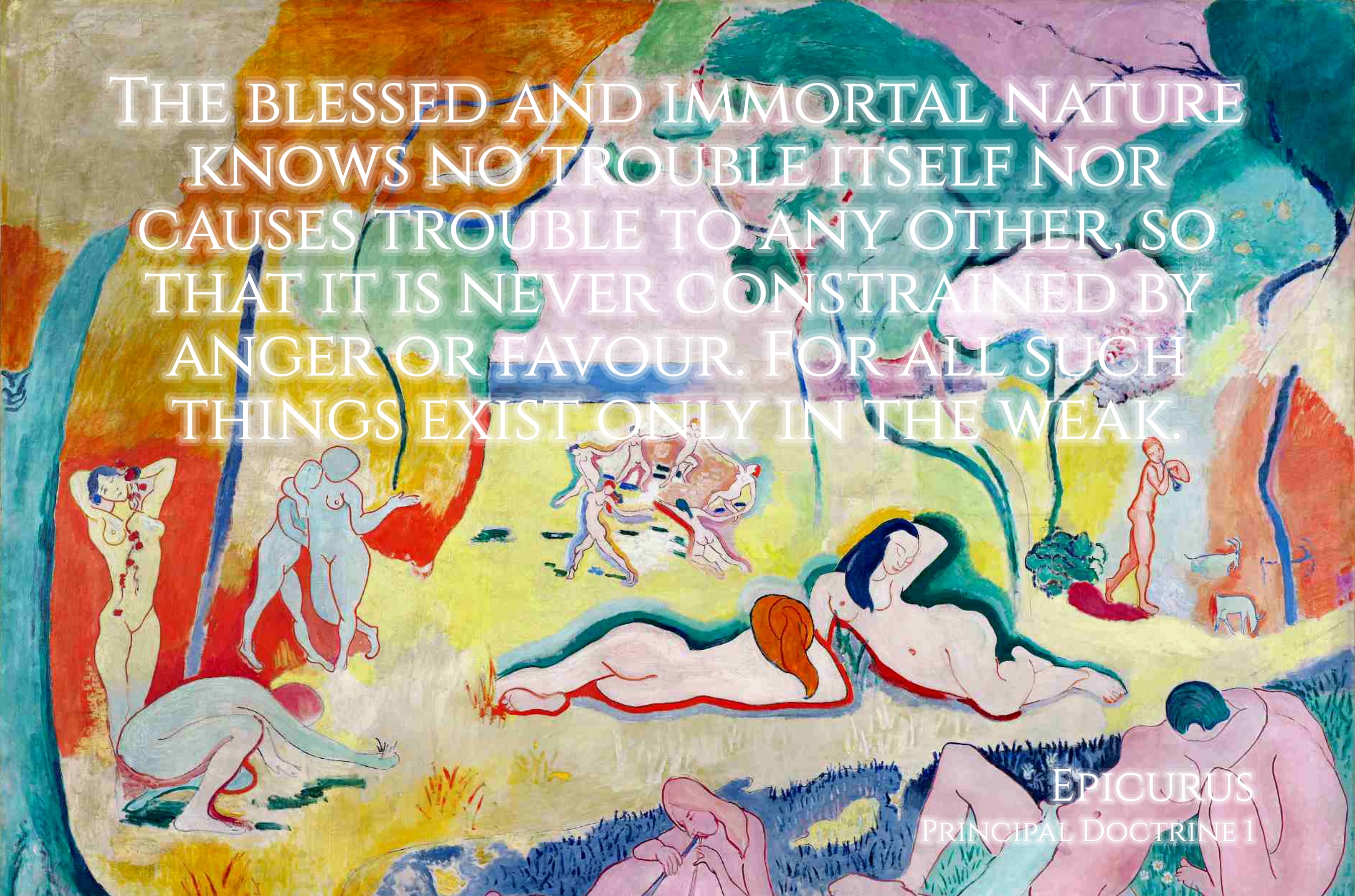 I "The blessed and immortal nature knows no trouble itself nor causes trouble to any other, so that it is never constrained by anger or favour. For all such things exist only in the weak." (Epicurus, Principal Doctrine 1)