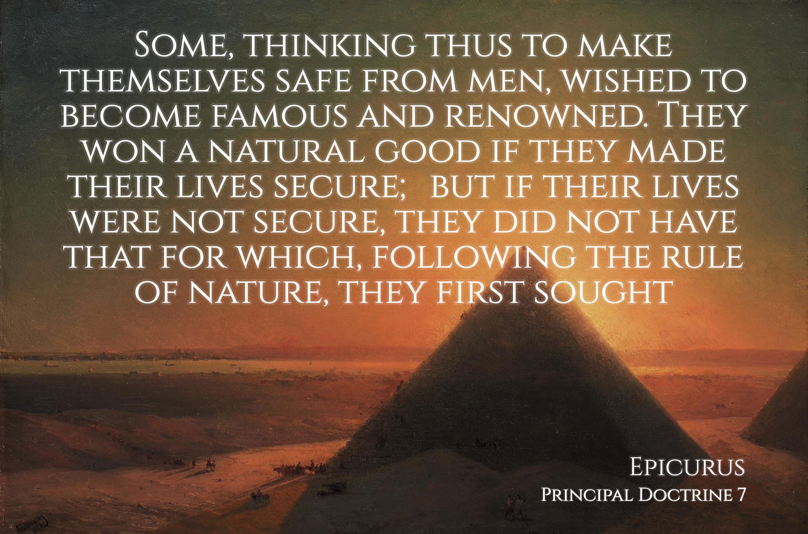 “Some, thinking thus to make themselves safe from men, wished to become famous and renowned. They won a natural good if they made their lives secure; but if their lives were not secure, they did not have that for which, following the rule of nature, they first sought.” (Epicurus, PD 7)