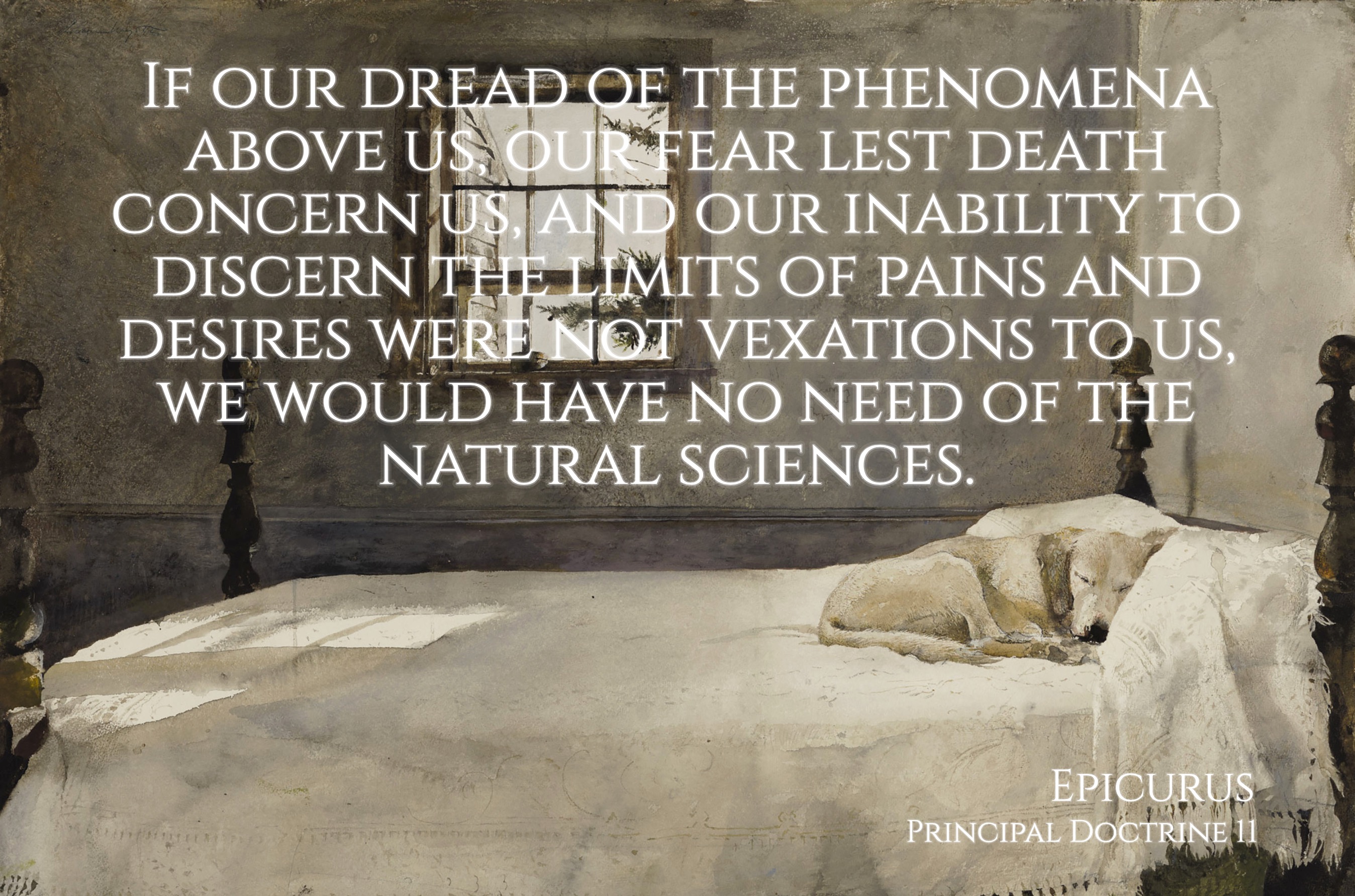 “If our dread of the phenomena above us, our fear lest death concern us, and our inability to discern the limits of pains and desires were not vexations to us, we would have no need of the natural sciences.” (Epicurus, Principal Doctrine 11)