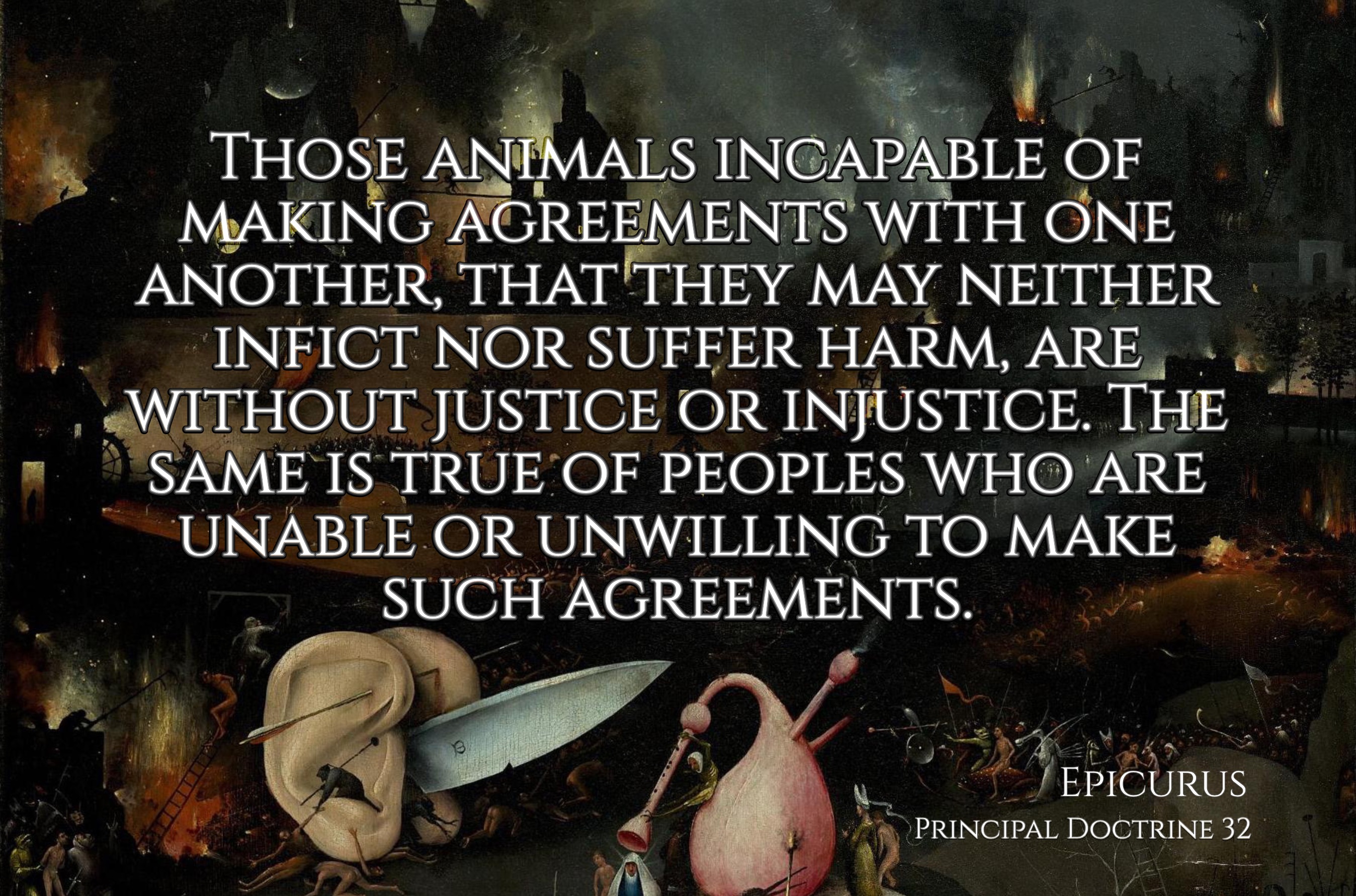 “Those animals incapable of making agreements with one another, that they may neither infict nor suffer harm, are without justice or injustice. The same is true of peoples who are unable or unwilling to make such agreements.” (Epicurus, Principal Doctrine 32)