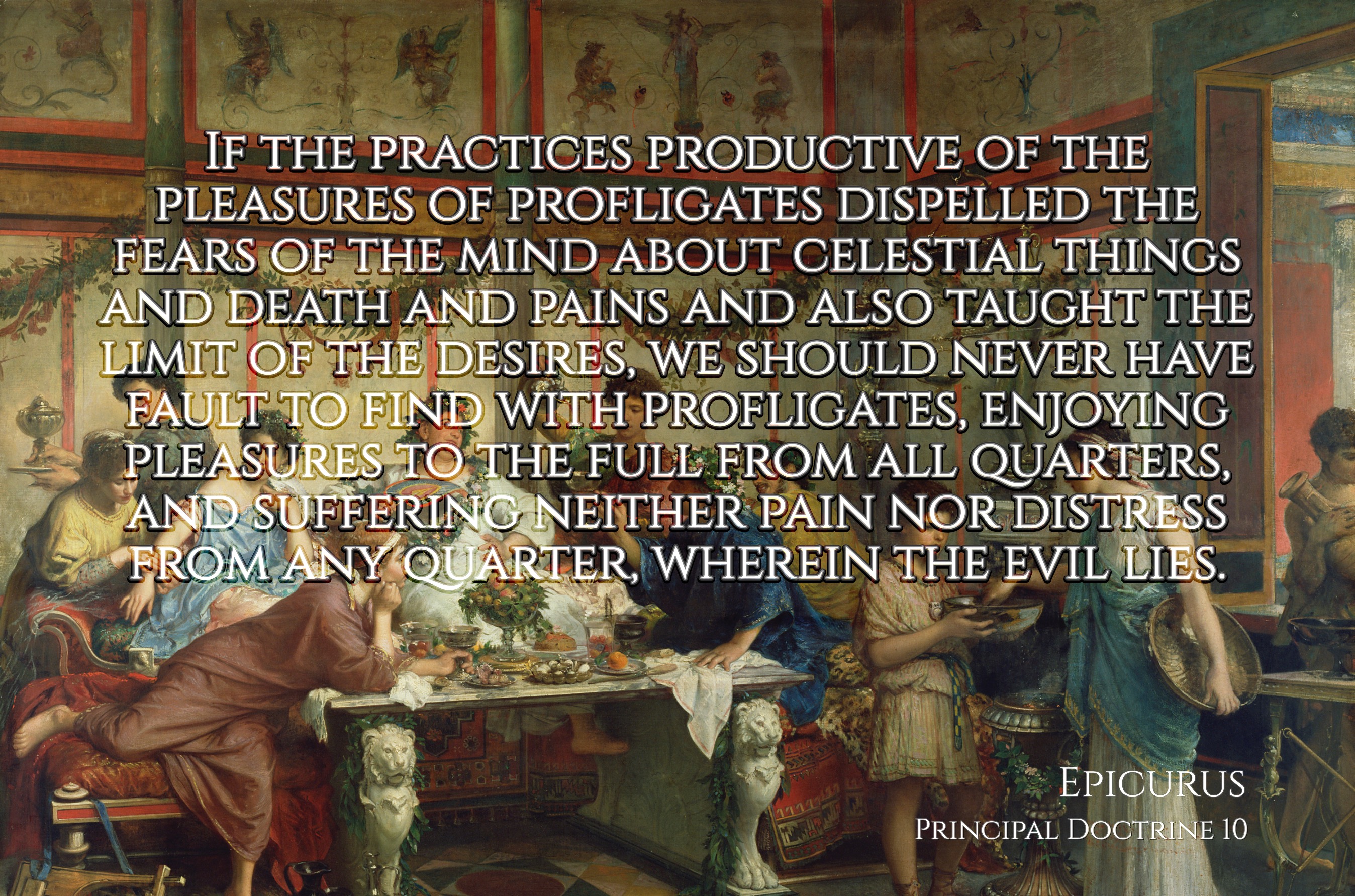 "If the practices productive of the pleasures of profligates dispelled the fears of the mind about celestial things and death and pains and also taught the limit of the desires, we should never have fault to find with profligates, enjoying pleasures to the full from all quarters, and suffering neither pain nor distress from any quarter, wherein the evil lies." (Epicurus, Principal Doctrine 10))