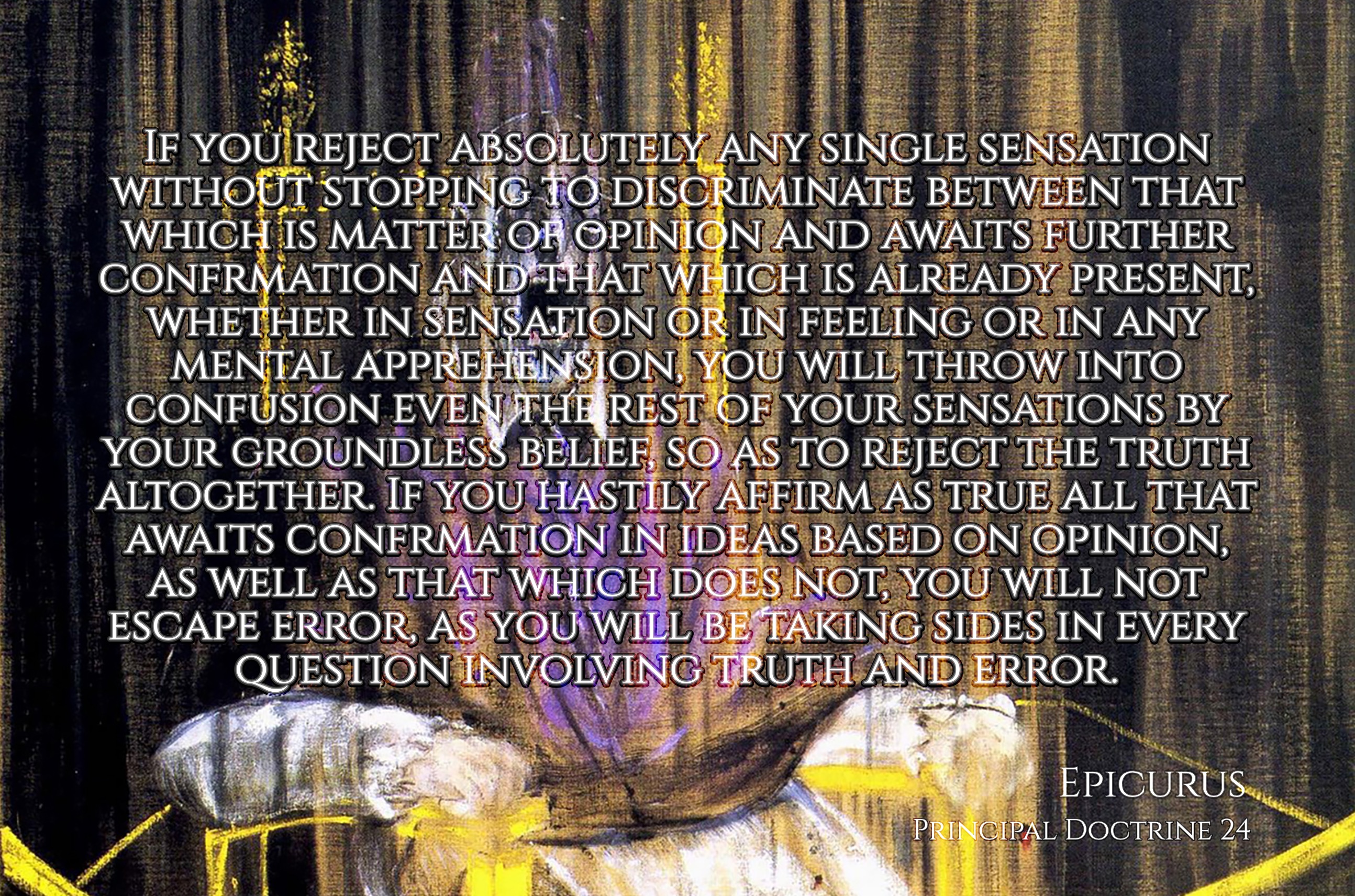 “If you reject absolutely any single sensation without stopping to discriminate between that which is matter of opinion and awaits further confrmation and that which is already present, whether in sensation or in feeling or in any mental apprehension, you will throw into confusion even the rest of your sensations by your groundless belief, so as to reject the truth altogether. If you hastily affirm as true all that awaits confirmation in ideas based on opinion, as well as that which does not, you will not escape error, as you will be taking sides in every question involving truth and error.” (Epicurus, Principal Doctrine 24)