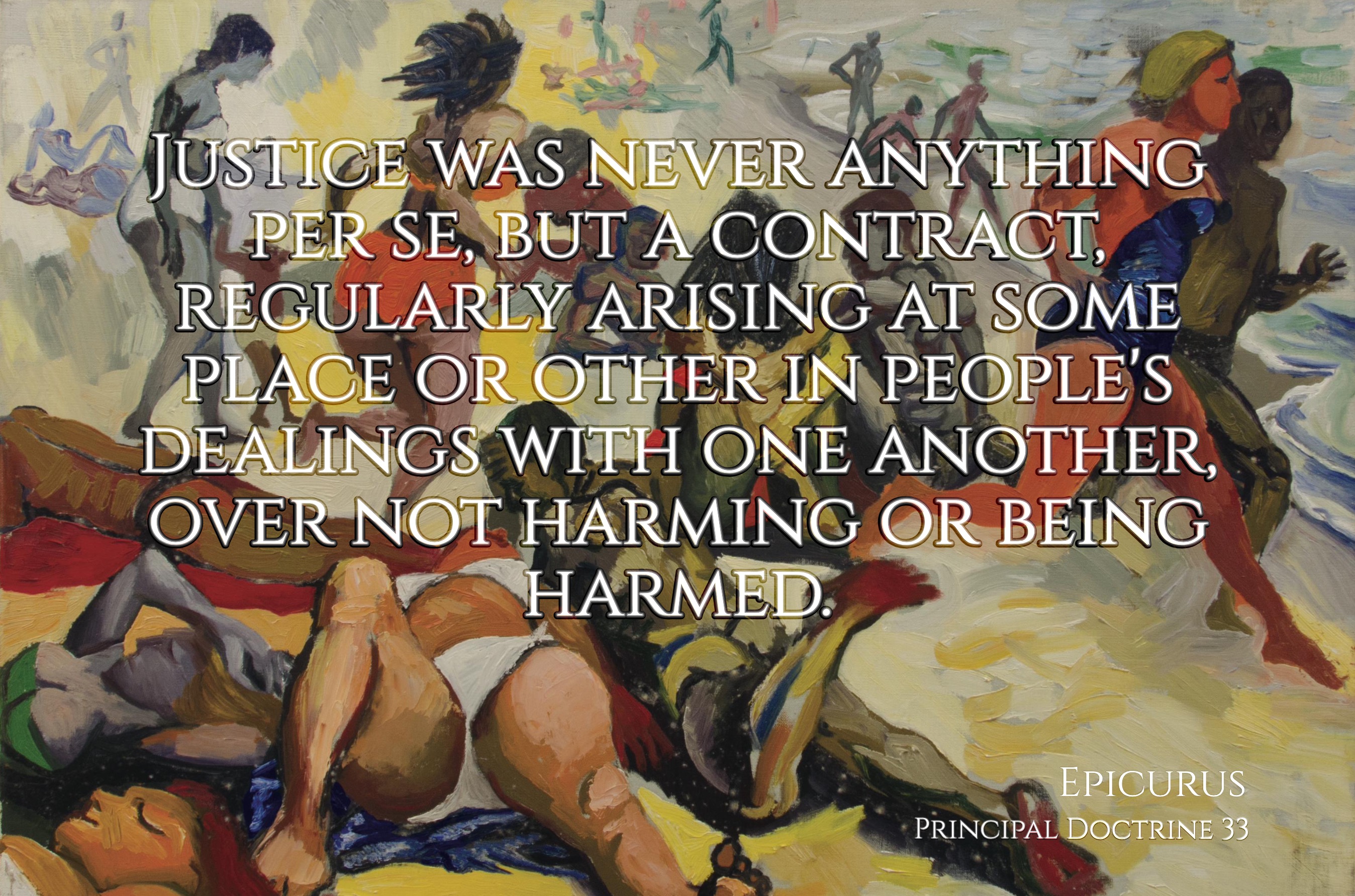 “Justice was never anything per se, but a contract, regularly arising at some place or other in people's dealings with one another, over not harming or being harmed. ” (Epicurus, Principal Doctrine 33)