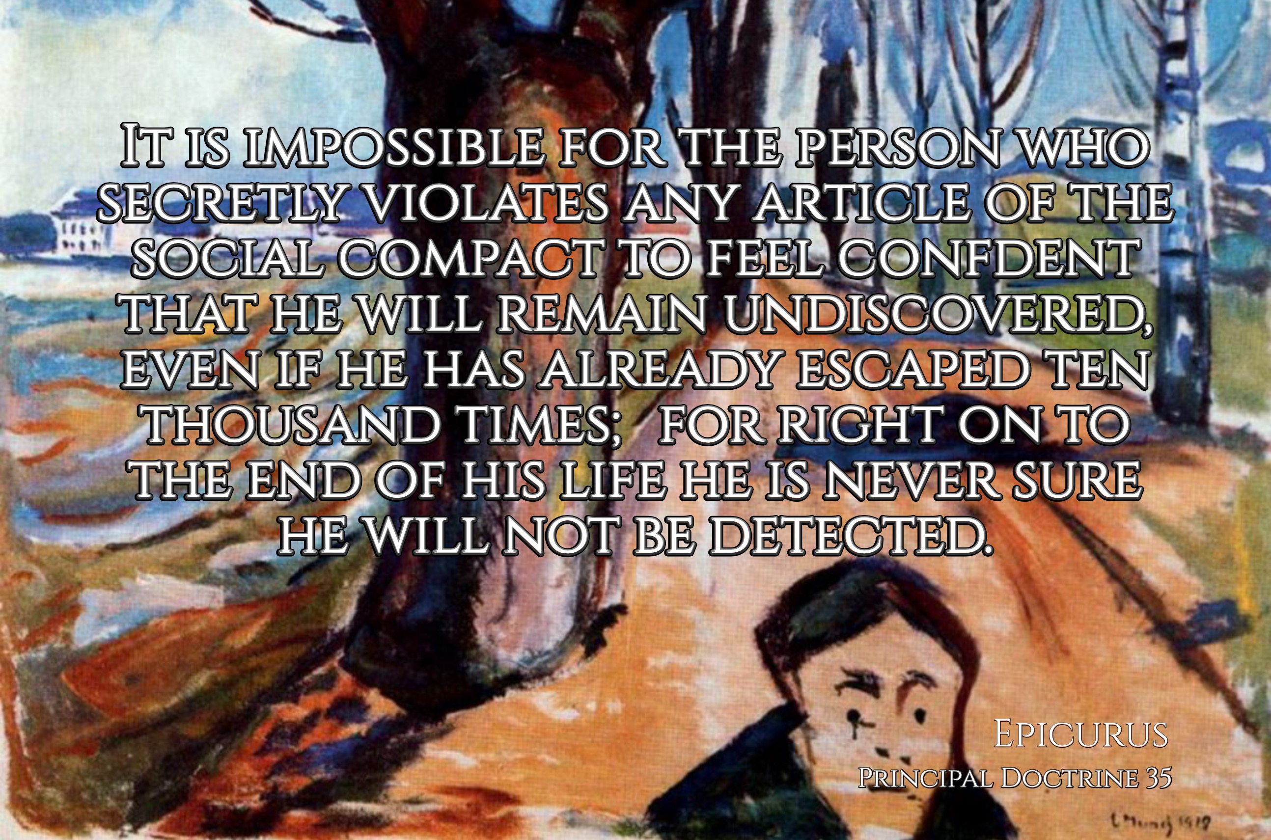 “It is impossible for the person who secretly violates any article of the social compact to feel confident that he will remain undiscovered, even if he has already escaped ten thousand times; for right on to the end of his life he is never sure he will not be detected.” (Epicurus, Principal Doctrine 35)
