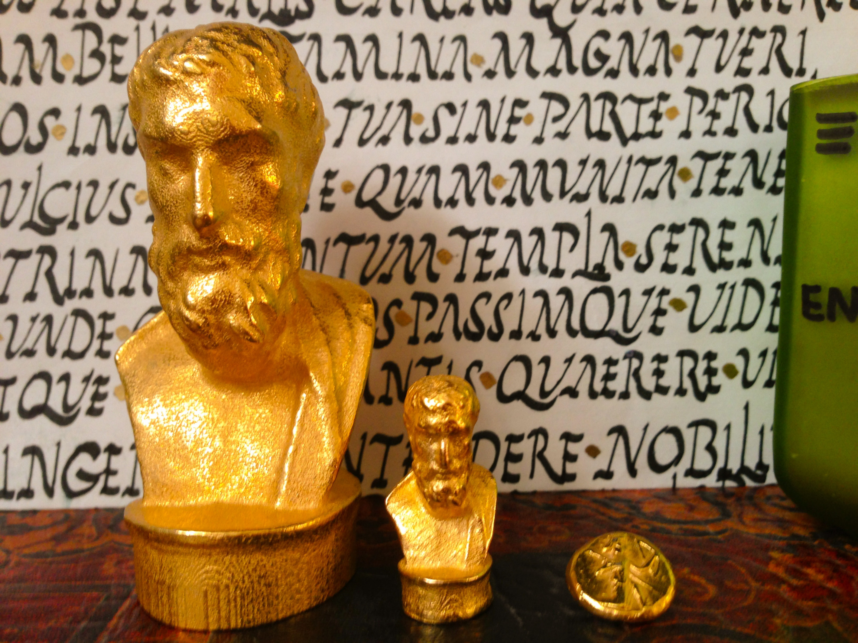 Small gold busts of Epicurus. Daric for size comparison.
