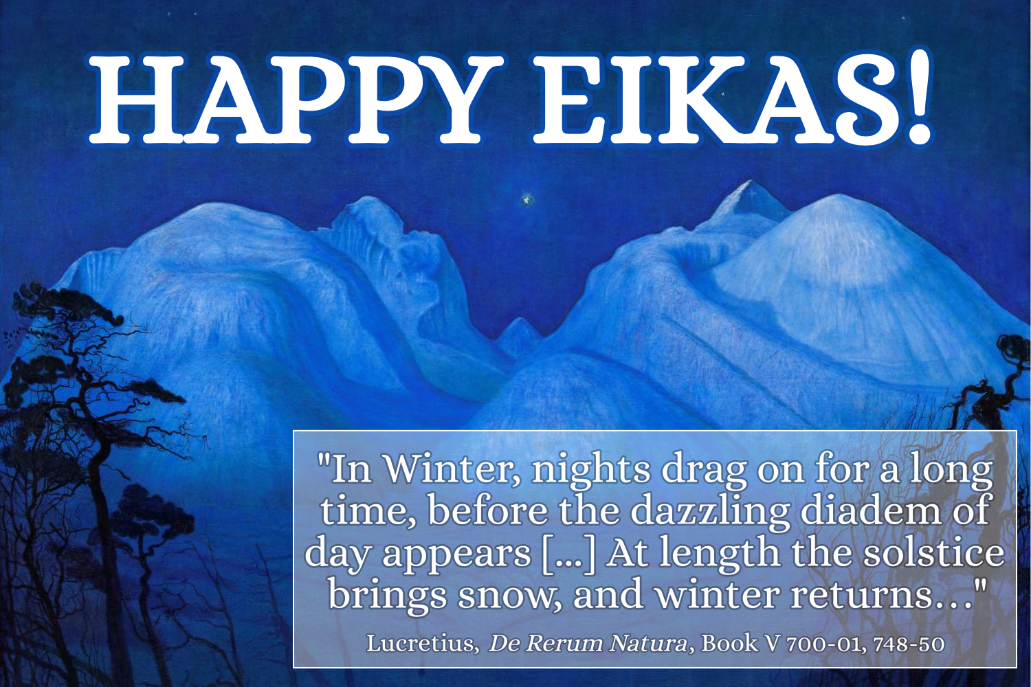 "Alternatively it may be that the air is denser in certain parts, with the result that the quivering brilliance of the solar fire is retarded beneath the earth and cannot easily penetrate the air and emerge above the horizon. This would explain why in winter nights drag on for a long time, before the dazzling diadem of day appears. [...] At length the solstice brings snow, and winter returns with numbing frost, followed by cold with teeth chattering." (Lucretius, De Rerum Natura, Book V 697-701, 748-750)