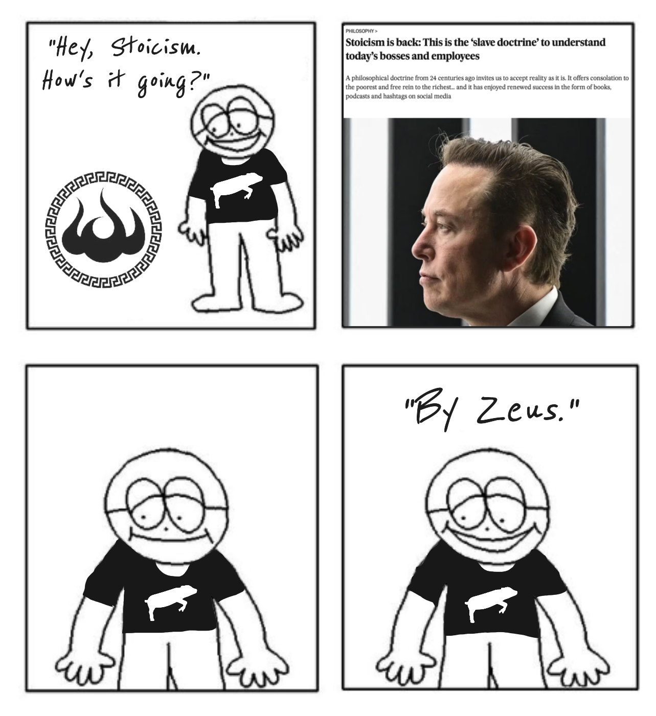 Evolutions of the meme render the last frame reading "Jesus Christ" (with resignation). I thought "Ne Dia!" went a step too far, so I compromised with "By Zeus."