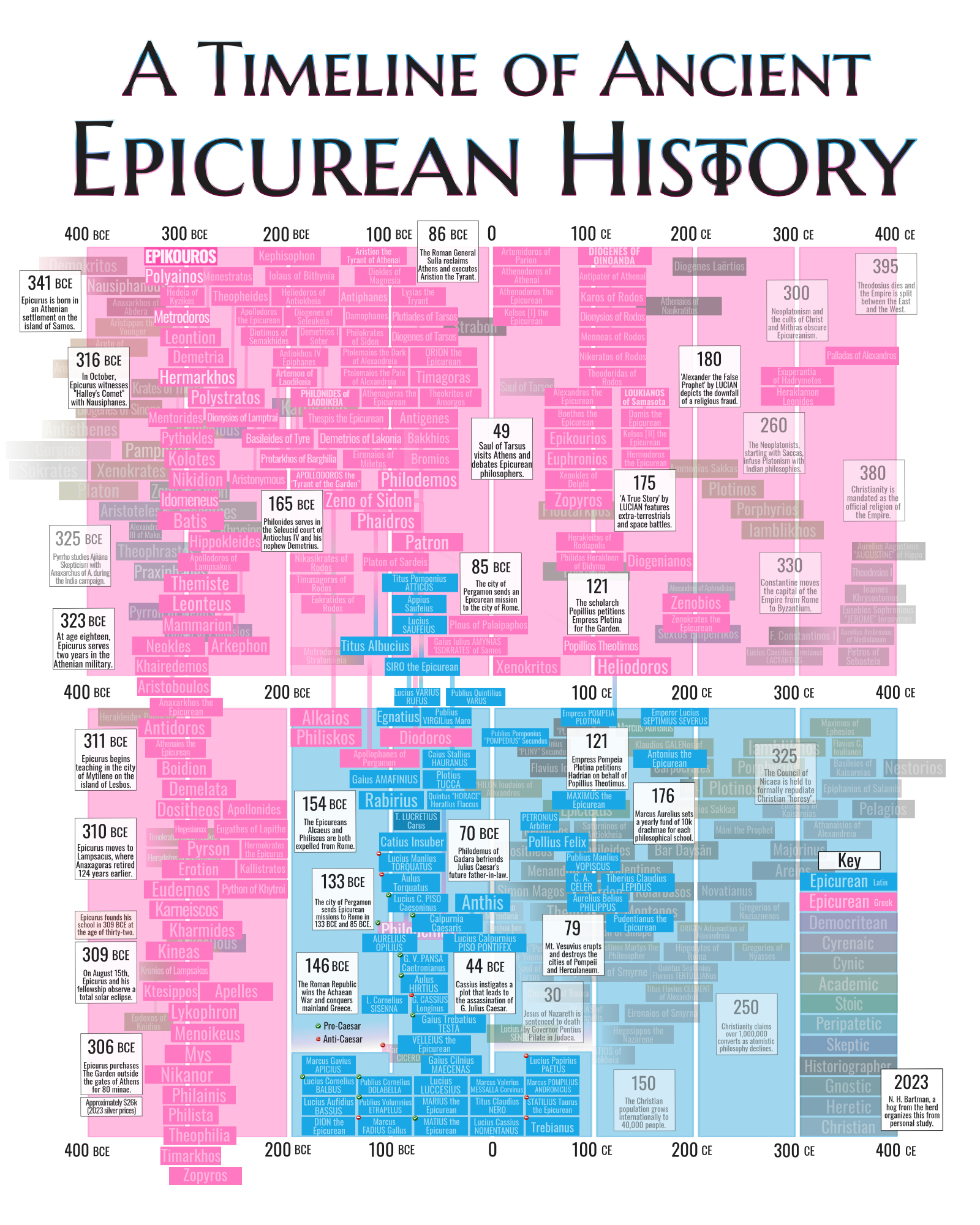 "I just wanted to reiterate how serendipitous it was that Joshua shared a timeline on which he had been working the other day. A year or two ago I intended on updating my study of Epicurean Philosophers into a visual format, but it seemed daunting and I happened to have some time lately. I have been quietly working on this project for the last month, so I was pleased to be reminded that great minds think alike.