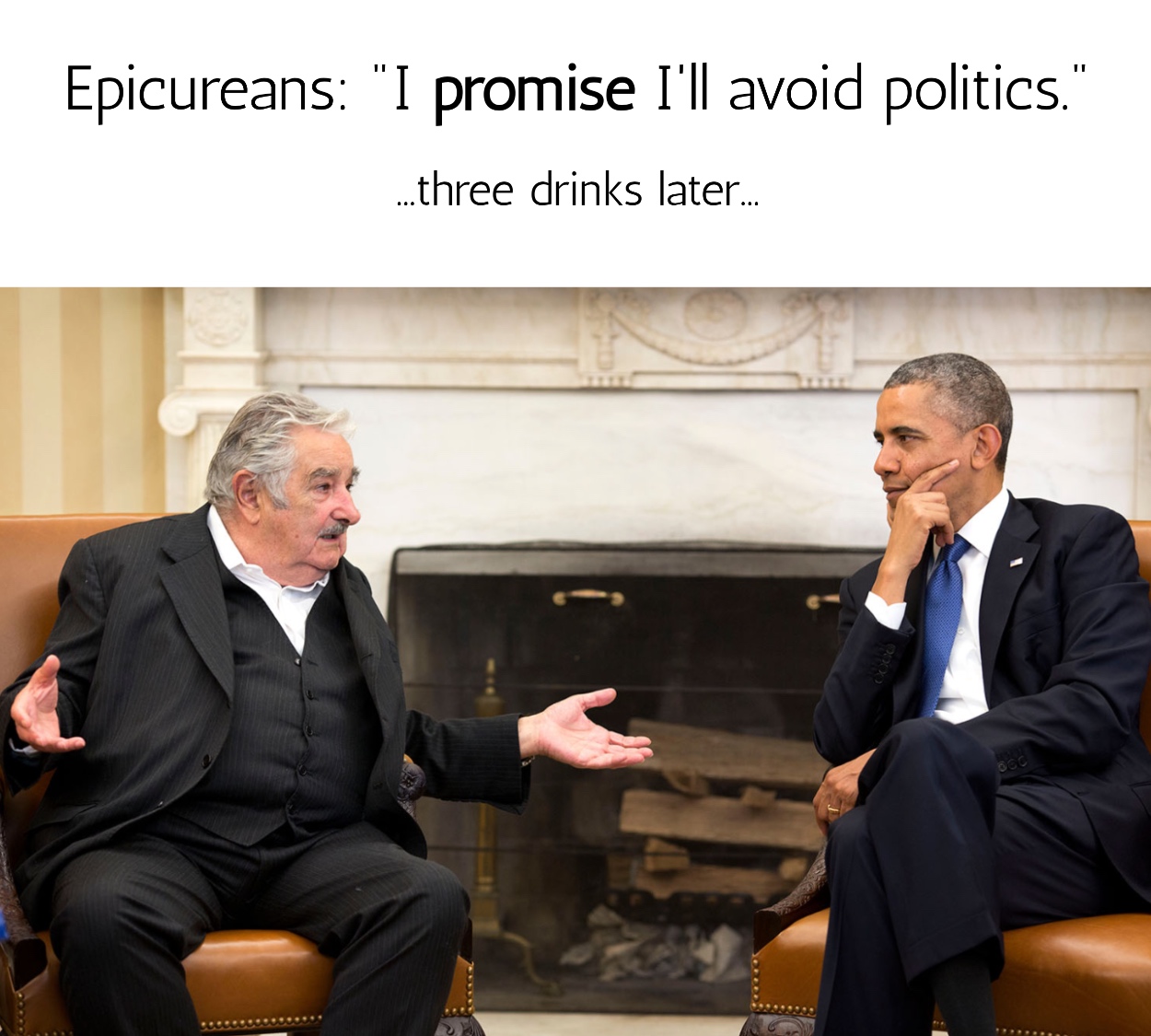On the left is José Mujica, a fascinating figure. He was Uruguay's 40th President and explicitly identifies as an Epicurean (and also, as an atheist). By some, he has been described as the "Philosopher's President". BBC ran an article about him in 2012 calling the "World's Poorest President", owing to his modest lifestyle and background as a farmer. He's worth a quick Google.