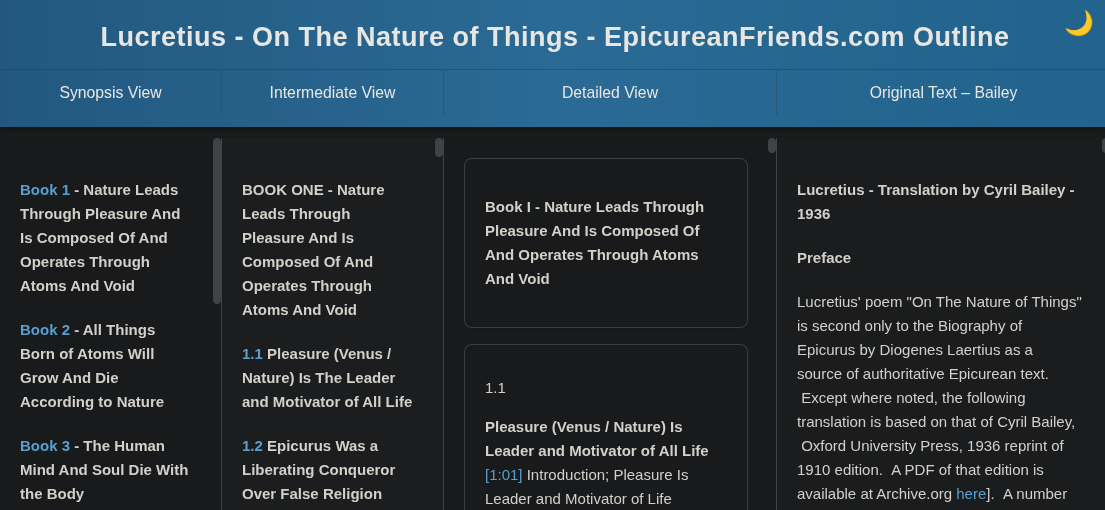 This edition provides a way to display one or more versions, allowing the user to choose between Latin, Bailey, Dunster, and Munro. An additional feature is that once you have focused on a particular section you can share with others a URL that takes you to the desire